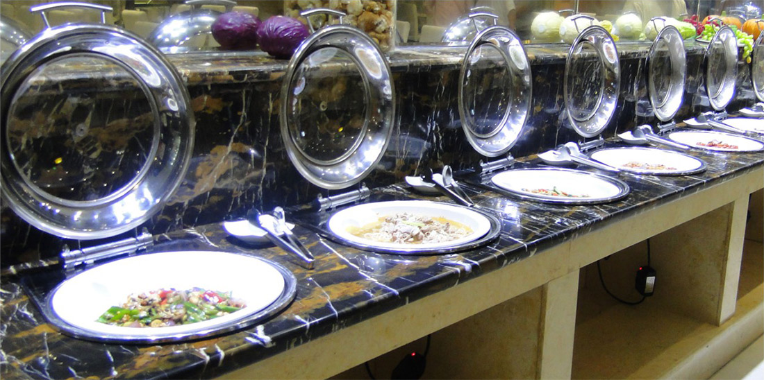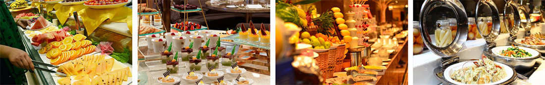 自助餐每餐提供川、湘、粵口味葷素菜式自由選擇任吃,配燉湯、水果。圍餐一般設(shè)為8人及10人一桌,提供幾葷幾素一湯一水果任吃。