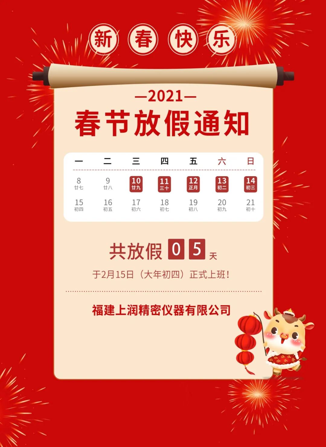 福建上潤2021年春節(jié)放假時間安排通知