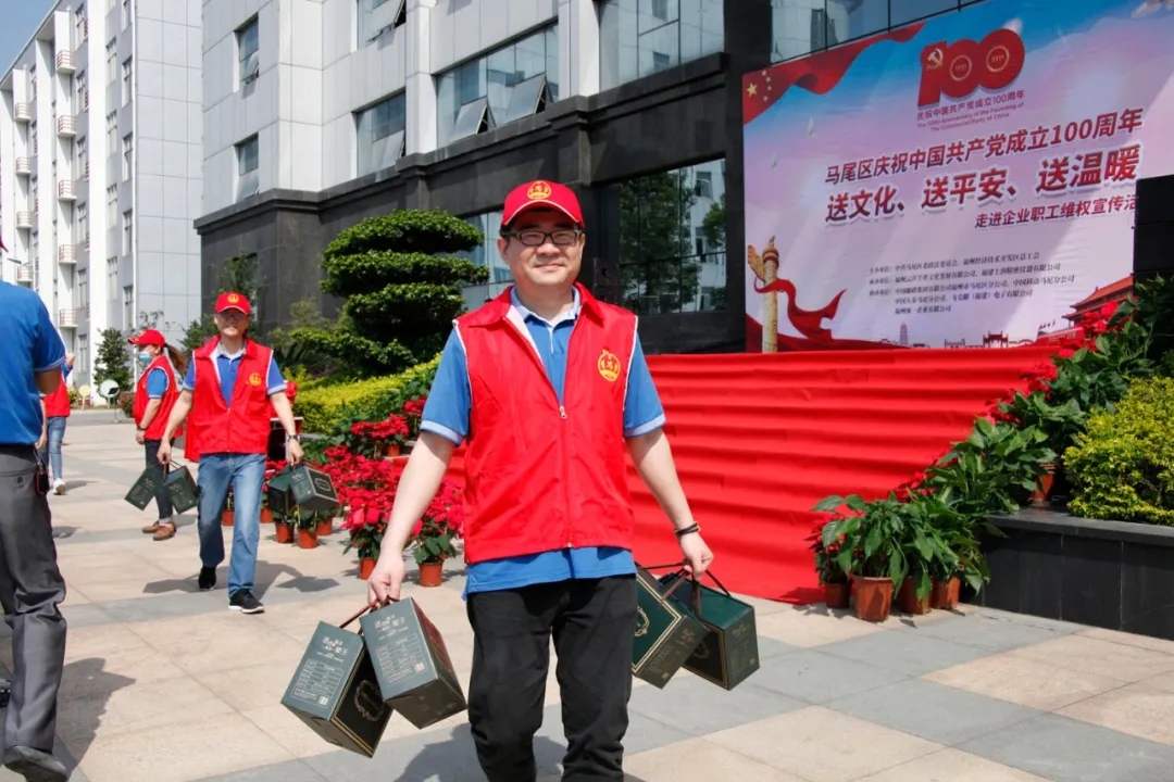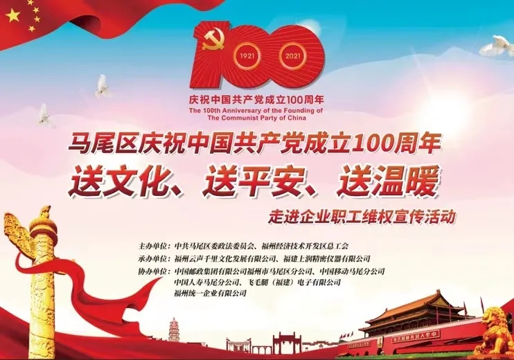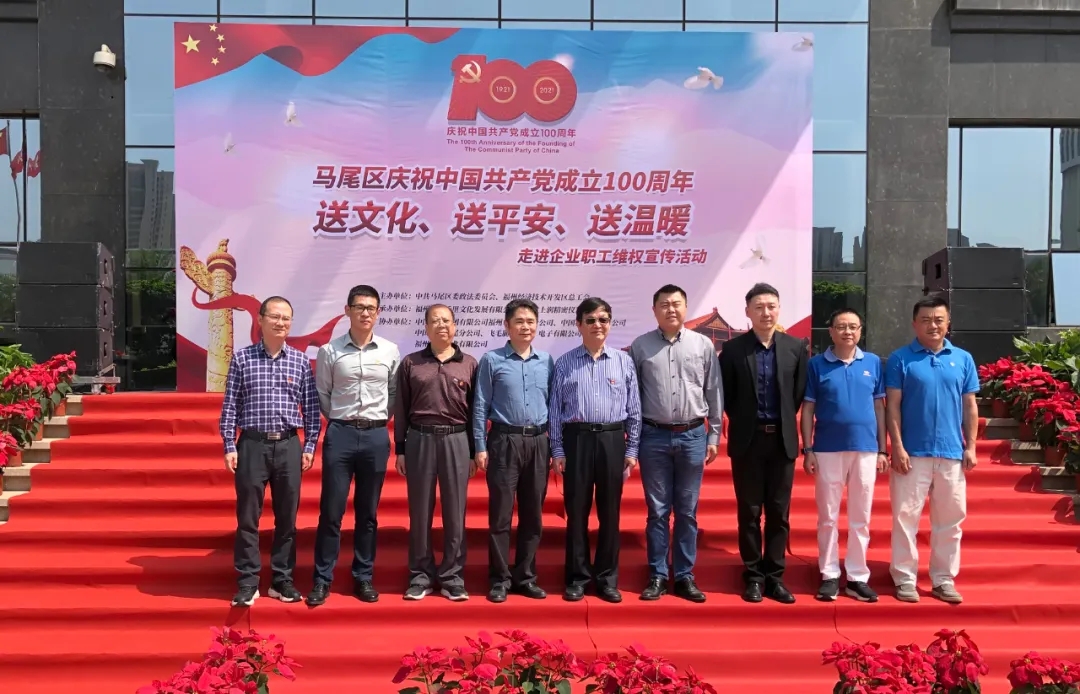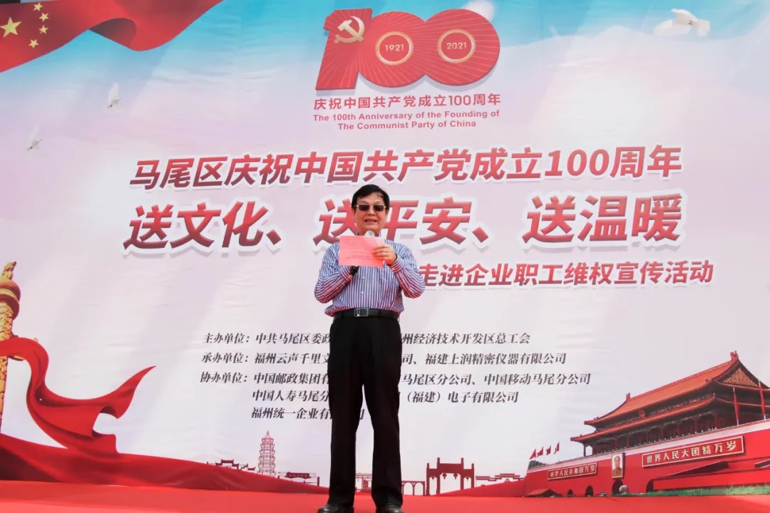 【概要描述】在中國共產(chǎn)黨建黨100周年之際,馬尾區(qū)開展慶祝建黨100周年“送文化、送平安、送溫暖”走進企業(yè)法治宣傳系列活動,啟動儀式于4月23日上午在福建上潤辦公大樓前廣場舉行。馬尾區(qū)總工會常務(wù)副主席羊福明、區(qū)政法委主任黃前進、科技園區(qū)工會主席張宙、馬尾移動分公司總經(jīng)理姜曉寧、中國人壽馬尾分公司總經(jīng)理紀亮等領(lǐng)導(dǎo)出席了本次活動;福建上潤董事長黃訓(xùn)松、副總裁鄒崇、傅雄晨、陳烈、總裁助理林仁祥、工會主席陳衛(wèi)東等領(lǐng)導(dǎo)