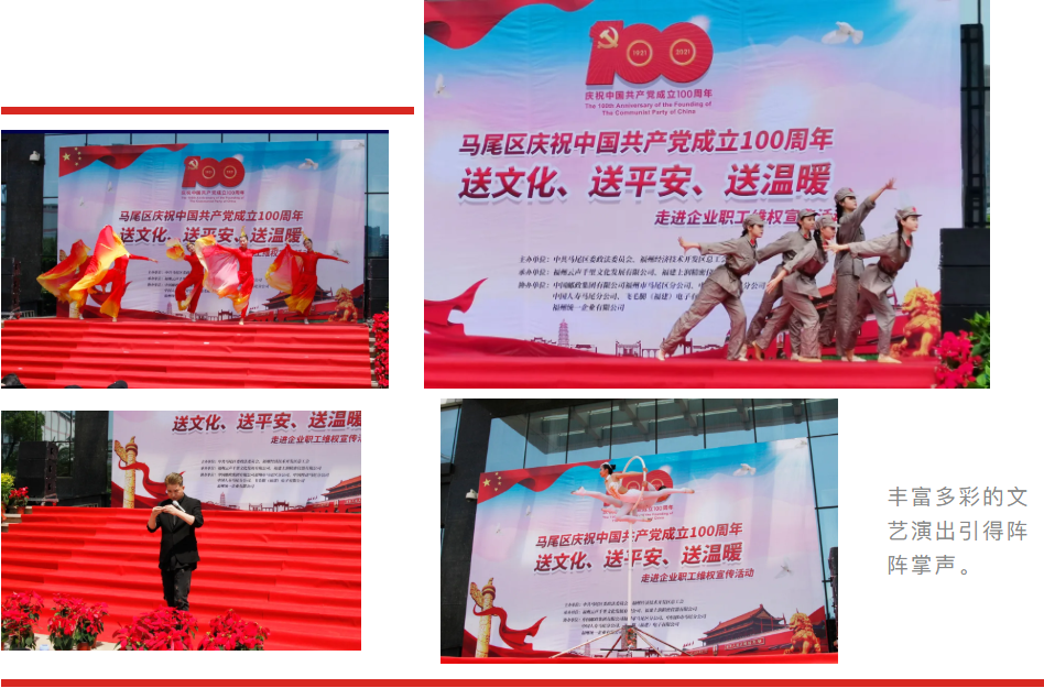 在中國共產(chǎn)黨建黨100周年之際,馬尾區(qū)開展慶祝黨100周年“送文化、送平安、送溫暖”走進企業(yè)法治宣傳系列活動,啟動儀式于4月23日上午在福建上潤辦公大樓前廣場舉行。馬尾區(qū)總工會常務(wù)副主席羊福明、區(qū)政法委主任黃前進、科技園區(qū)工會主席張宙、馬尾移動分公司總經(jīng)理姜曉寧、中國人壽馬尾分公司總經(jīng)理紀亮等領(lǐng)導(dǎo)出席了本次活動;福建上潤董事長黃訓(xùn)松、副總裁鄒崇、傅雄晨、陳烈、總裁助理林仁祥、工會主席陳衛(wèi)東等領(lǐng)導(dǎo)與職工一起觀看了文藝匯演。此次活動得到中國郵政馬尾分公司、中國移動馬尾分公司、中國人壽馬尾分公司、飛毛腿集團、福州統(tǒng)一企業(yè)的大力支持。