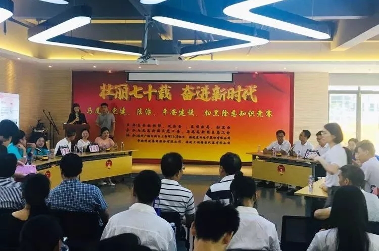 2019年8月6日上午,為紀(jì)念建國70周年,進(jìn)一步強(qiáng)化企業(yè)員工黨務(wù)知識(shí)和法律意識(shí),營造良好的黨建引領(lǐng)和企業(yè)法治氛圍,馬尾區(qū)“火炬先鋒”黨建聯(lián)盟在高新園區(qū)“火炬先鋒”黨群活動(dòng)中心舉辦了“一月一主題”活動(dòng)暨壯麗七十載 奮進(jìn)新時(shí)代“黨建、法治、平安建設(shè)、掃黑除惡”知識(shí)競(jìng)賽。此次比賽的參賽隊(duì)伍由上潤精密儀器有限公司、福建星云電子股份有限公司、華映集團(tuán)股份有限公司、福建高龍集團(tuán)有限公司、中建商品混凝土(福建)有限公司、興鋒盈集團(tuán)有限公司和志品技術(shù)工程有限公司7家非公企業(yè)黨組織代表隊(duì)組成。