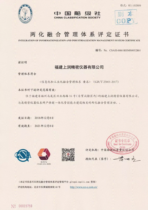 2018年12月8日,福建上潤精密儀器有限公司成功通過兩化融合管理體系貫標評定,獲得由中國船級社頒發(fā)《兩化融合管理體系評定證書》,成為符合 GB/T23001-2017 標準的國家級兩化融合管理體系貫標企業(yè)。
